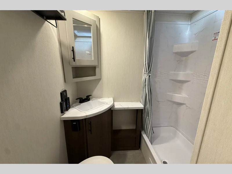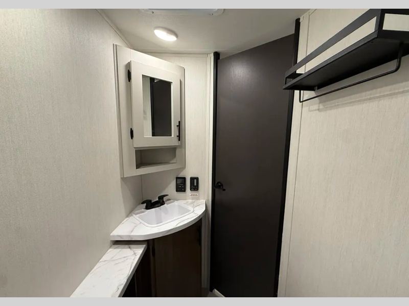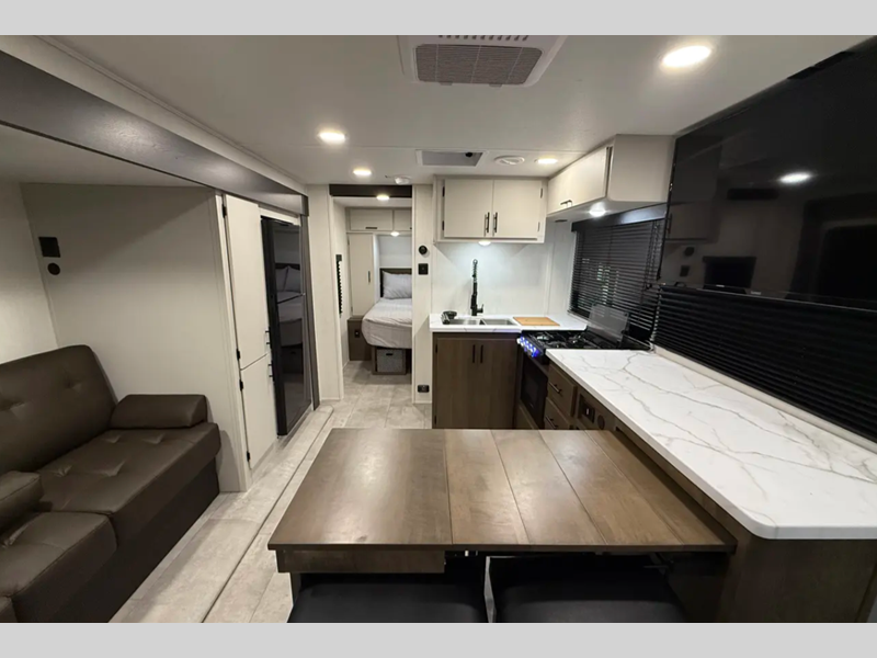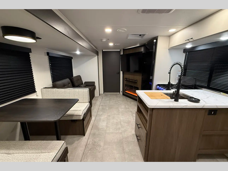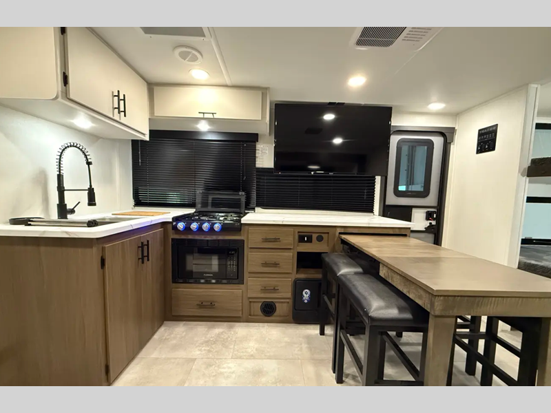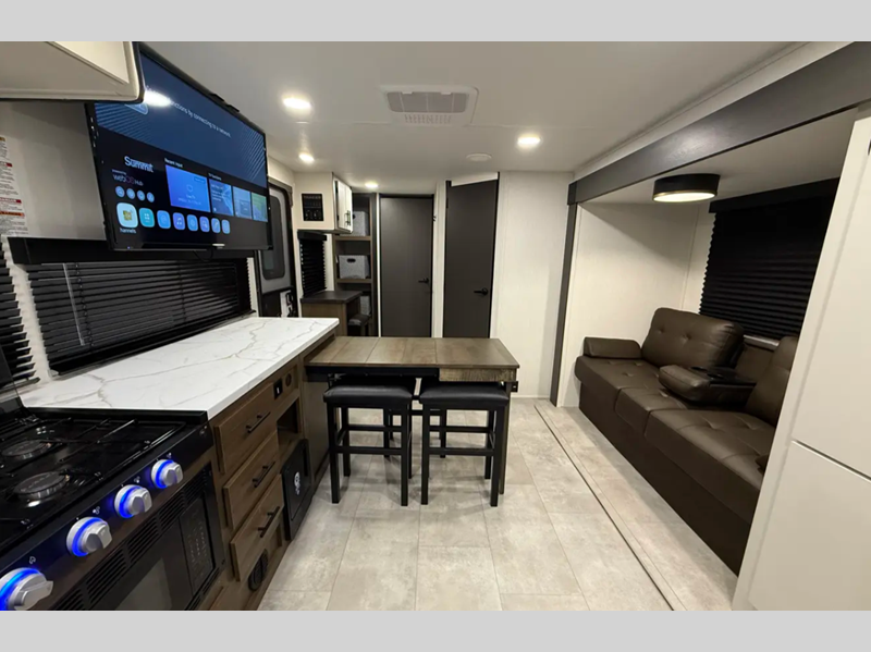 Sleeps 3 Slides 1 Length 23 ft 4 in Ext Width 8 ft Ext Height 10 ft 9 in Hitch Weight 585 lbs Dry Weight 5013 lbs Cargo Capacity 2572 lbs Fresh Water Capacity 42 gals Grey Water Capacity 34 gals Black Water Capacity 34 gals Furnace BTU 30000 btu Available Beds Camp King Refrigerator Type 12V Cooktop Burners 3 Number of Awnings 1 Water Heater Type Tankless AC BTU 15000 btu TV Info LR Smart TV Awning Info Power Awning w/LED Lights Axle Count 2 Shower Type Standard Solar Wattage 200 watts Similar Floorplans